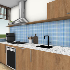 Voor de keuken heb ik meer rust en samenhang tussen alle spullen gecreëerd. De keuken en de hal hebben hetzelfde moodboard. Doordat er geen deur tussen beide ruimtes zit wilde ik deze ook als één geheel laten voelen.