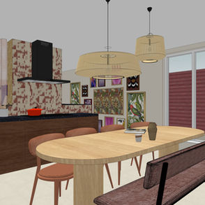 De bestaande keuken blijft, maar wordt gewrapt in een donkere houtprint. Om ook hier wat speelsheid toe te voegen heb ik gekozen voor een wandtegel met print. Door deze door te laten lopen op de trap trek je de keuken en woonkamer meer naar elkaar toe.