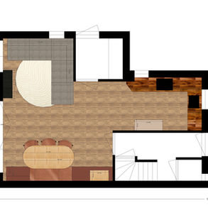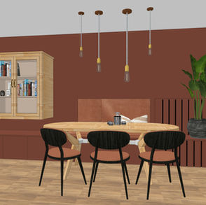 De woonstijl voor dit huis is 'Japandi in the Desert'. Deze stijl kenmerkt zich door strakke maar zachte vormen en natuurlijke materialen. Het kleurenpallet gaat van crème tot aan roest-oranje/rood. De kleuren zijn zo aangebracht dat de drie zones; koken, eten en zitten, nog beter gedefinieerd worden.